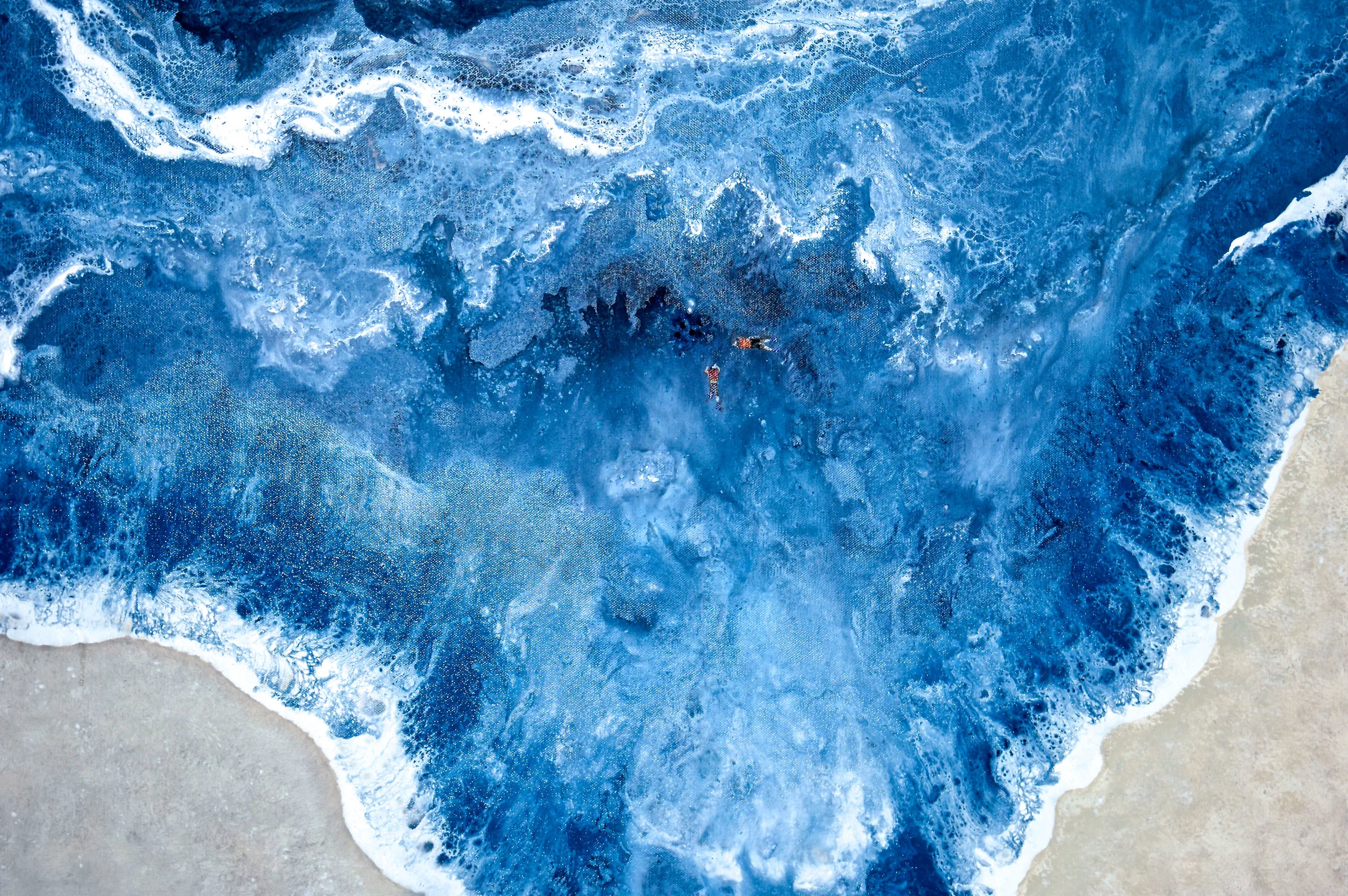 Fluid acrylic on canvas representing an aerial view of a scuba diving scene. The deep blues of the water reminds the colors of the Celebes Sea in Malaysia.