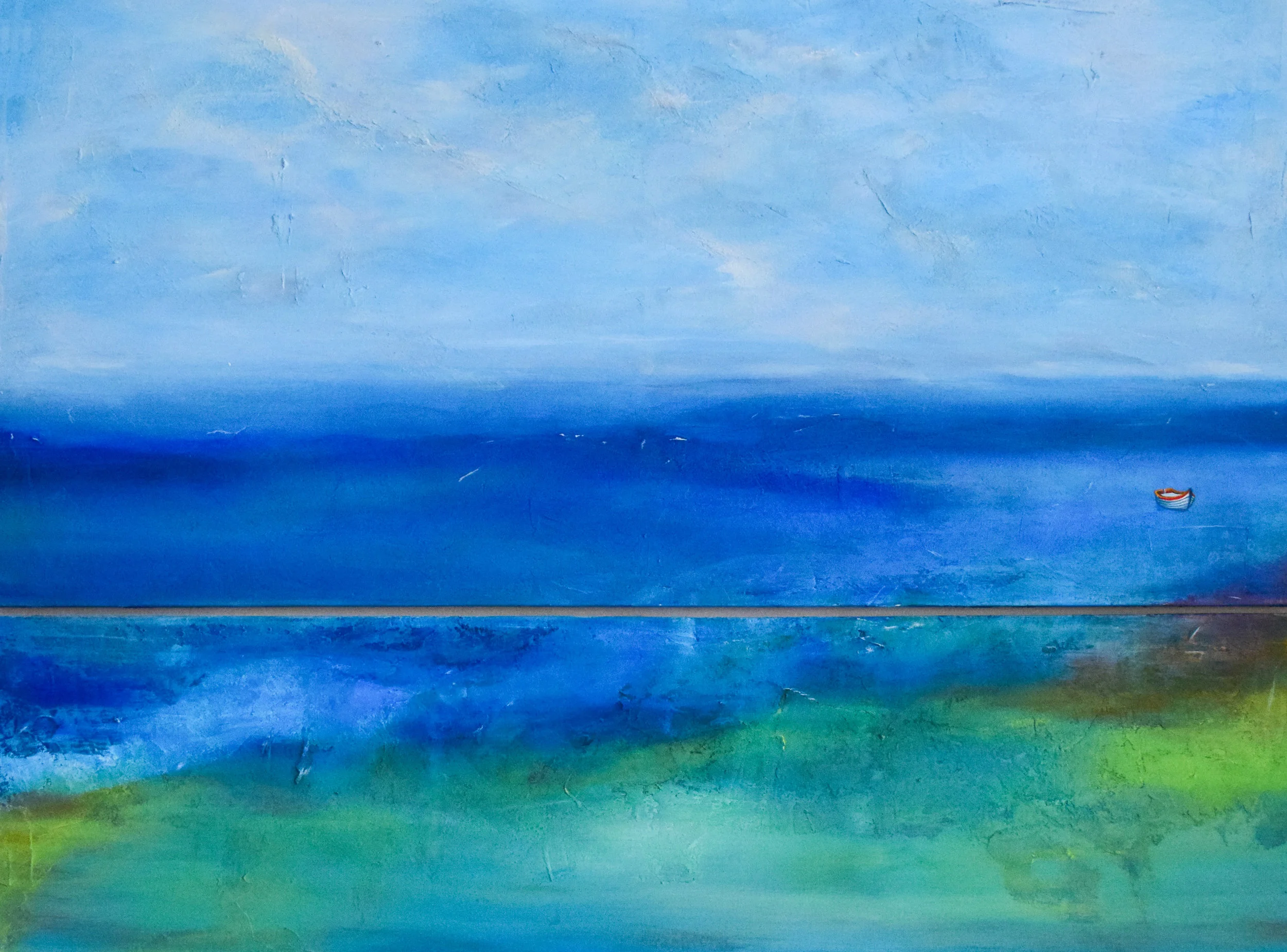 Isolated peaceful sunset. Dark blue crystal water rocky beach of an uncertain destination.